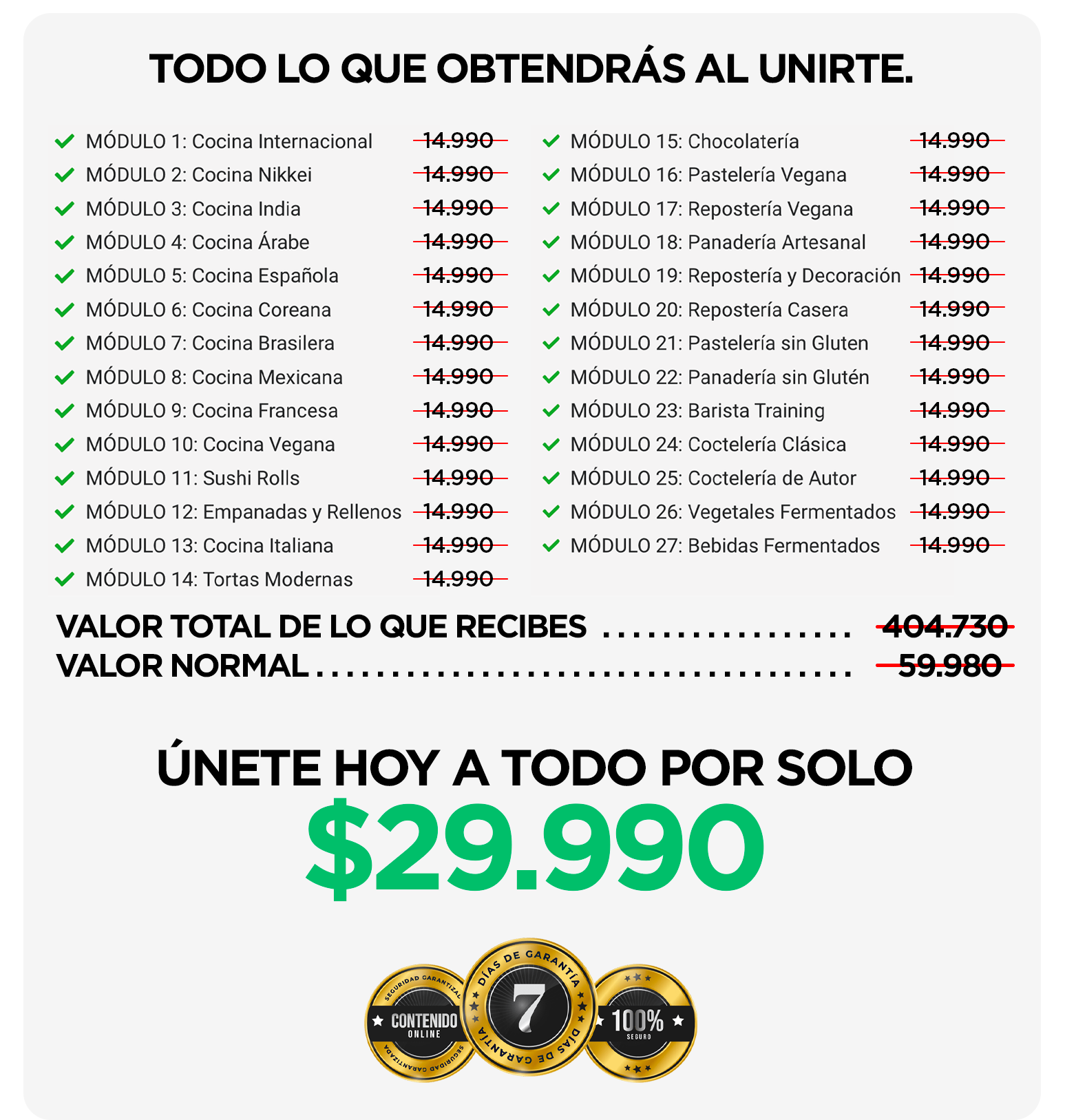¡ACCESO DE POR VIDA! Tendrás acceso ilimitado a este curso durante el tiempo que desee y podrás adelantar o retroceder cada receta las veces que quieras.