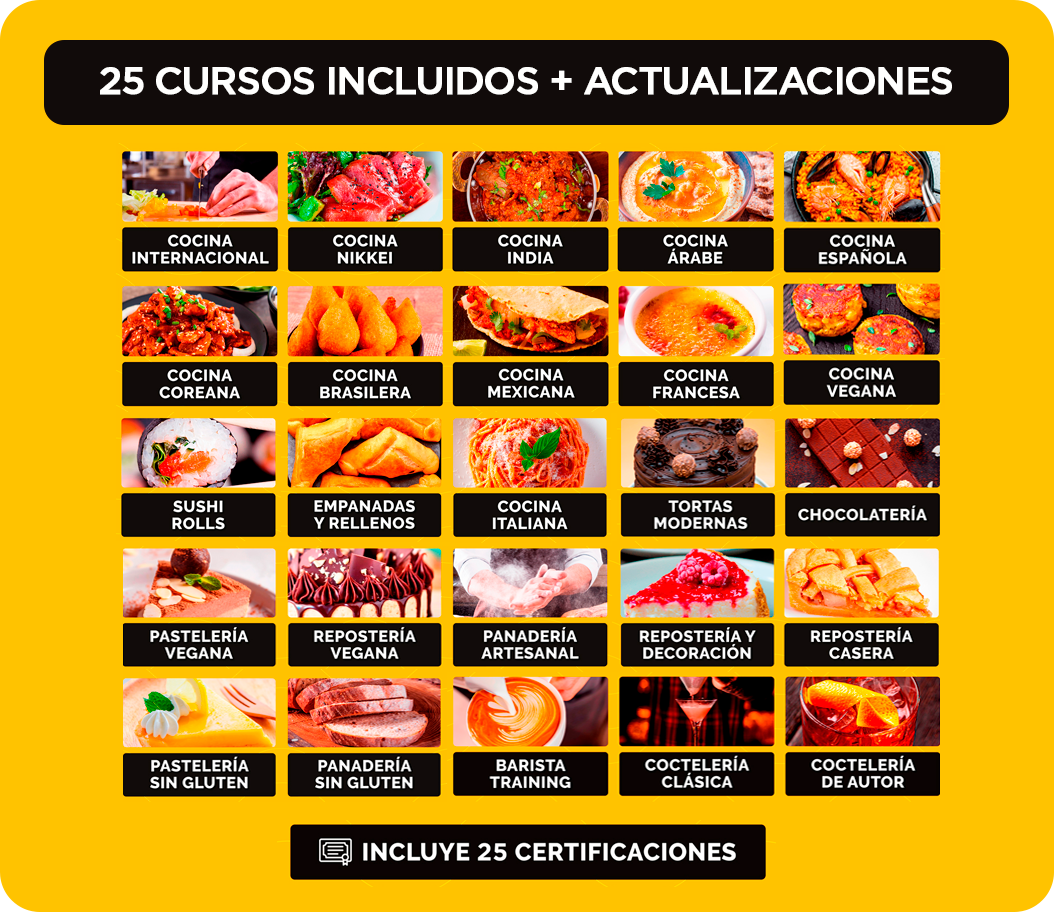 Todas las recetas que aprenderás contienen los ingredientes, preparación paso a paso y fichas técnicas en formato pdf para descargar.