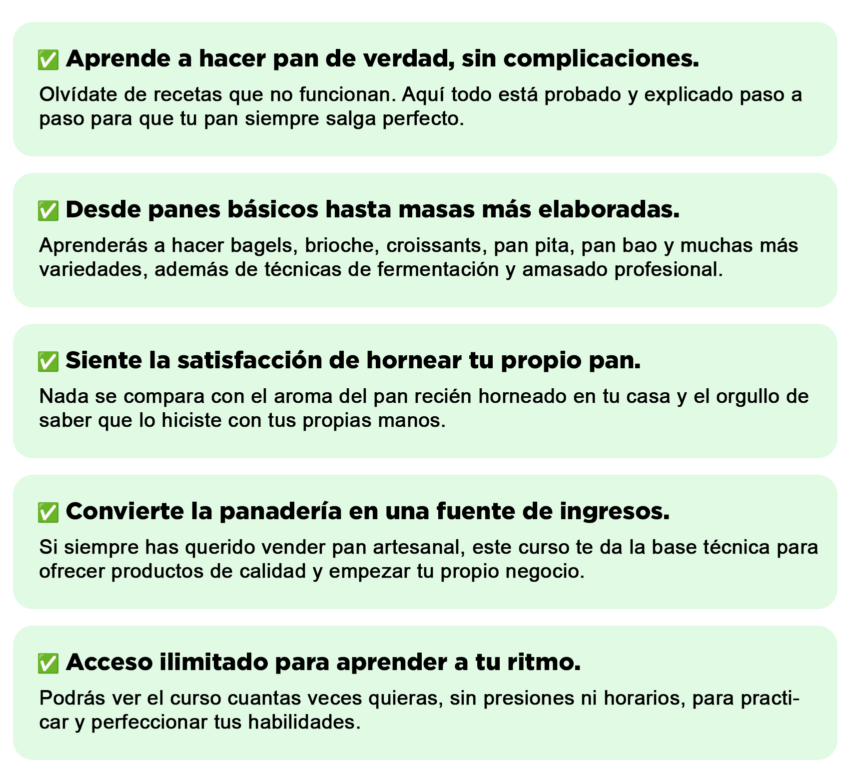 Ya sea que quieras hacer pan para tu familia o incluso empezar a venderlo, aquí aprenderás todo lo que necesitas para dominar la panadería artesanal.